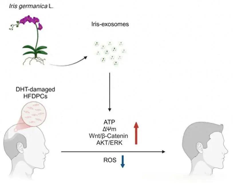 在治疗困局亟待突破之际,韩国建国大学与 Shinsegae International Inc. 的联合团队于2025年在《International Journal of Molecular Sciences》发表了一项里程碑研究。他们从常见观赏植物鸢尾(Iris germanica L.)的根茎中分离出直径约120纳米的外泌体(Iris-exosomes),这些天然纳米囊泡富含 miRNA-218-5p 等生物活性分子,在实验室中展现出对 DHT 损伤毛囊细胞的卓越修复能力。