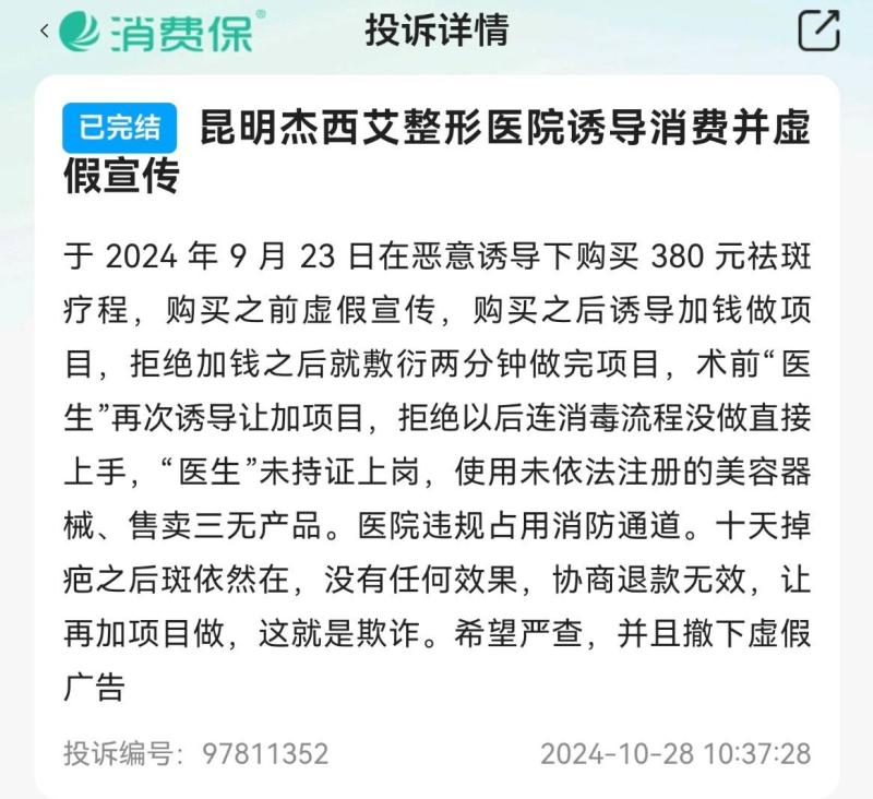 这位消费者称,自己在2024年9月23日被昆明杰西艾整形医院以“恶意诱导”的方式购买了价值380元的祛斑疗程。