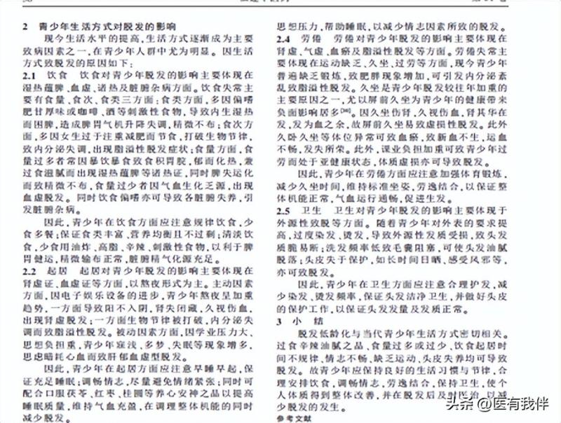 在2020年7月的一篇文献中提到了,脱发的低龄化与现在年轻人的生活方式密切相关。不管是熬夜追剧,饮食重口味还是过度减肥健身,等方方面面都会引起脱发。