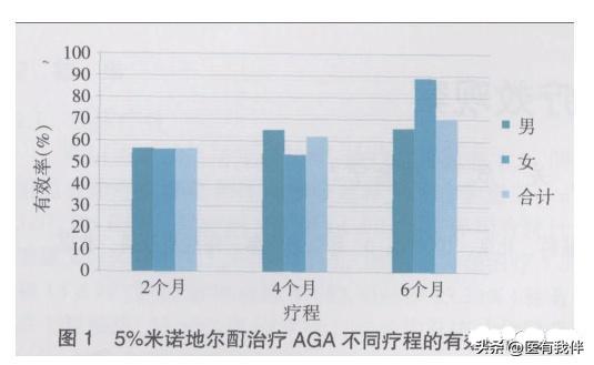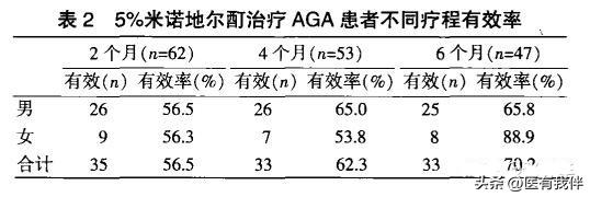 外用5%米诺地尔连续使用2个月 , 有56.5%的患者可以看到不同程度的改善,并且随着疗程的延长有效率逐渐升高,使用6个月后有效率达到 70.2%。