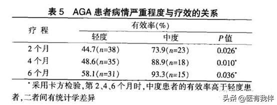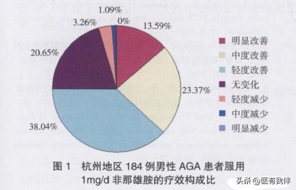 试验最终结果:1mg/d非那雄胺治疗杭州地区AGA男性患者的总有效率为75% 其中轻度改善、中度改善和 明显改善分别为38.04%、23.37%和13.59%。