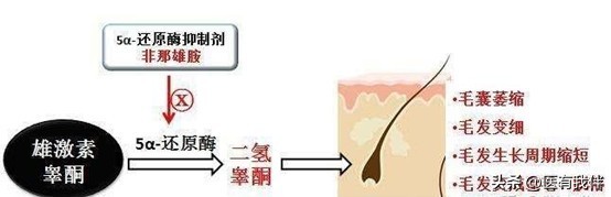 非那雄胺是特异性的Ⅱ型 5-α 还原酶抑制剂,服用吸收后,抑制血清中的睾酮转化为二氢睾酮。5-α 还原酶的活性主要是集中在真皮乳头细胞,而非那雄胺能抑制真皮乳头中 80%以上的5-α 还原酶活性,对毛发生长具有显著促进作用。