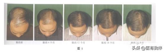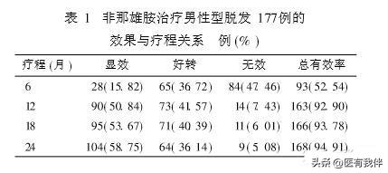 根据论著:《非那雄胺治疗男性型秃发疗程与疗效的相关性分析》研究者选取177例雄激素源性脱发患者,口服非那雄胺 1mg , 每天 1片,连服 24个月以上,并对患者在服药前和服药后 6个 月、12个月、18个月及 24个月拍摄头部脱发区, 比较 4个时段的疗效。