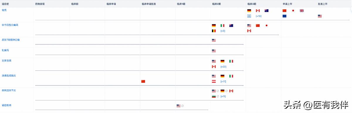 现阶段该药物共涉及8个适应症,包括斑秃、非节段型白癜风、皮肤T细胞淋巴瘤、乳糜泻、克罗恩病、溃疡性结肠炎、类风湿关节炎及一个非在研的肾脏疾病,有关肾功能不全的I期临床试验启动于2019年8月,后由于疫情,试验遭遇大范围延迟而终止。这些适应症均已进入临床试验阶段。有关斑秃的研究进展,除在美国获批外,在中、欧、日、英已递交上市申请。