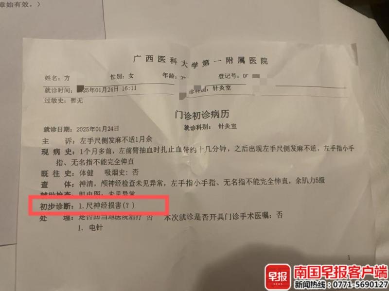 近日,防城港的方女士反映,几个月前她在南宁碧莲盛医疗美容有限公司(以下简称碧莲盛)接受植发手术后,发现曾抽血的左手臂发麻及两个手指无法伸直等症状。经医生诊断为左手尺神经损害,方女士认为该损害或与植发手术操作不当有关,要求对方赔偿未果。方女士介绍,去年11月...